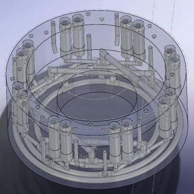 First, you should understand that the pool will have an 8' diameter round hot tub stuck into the otherwise straight side. 16 streams of water will issue from jets embedded in the wall of that hot tub, and land in a small circle in the center. There is a lot of plumbing to make this work, and here is a partial CAD model of it all: